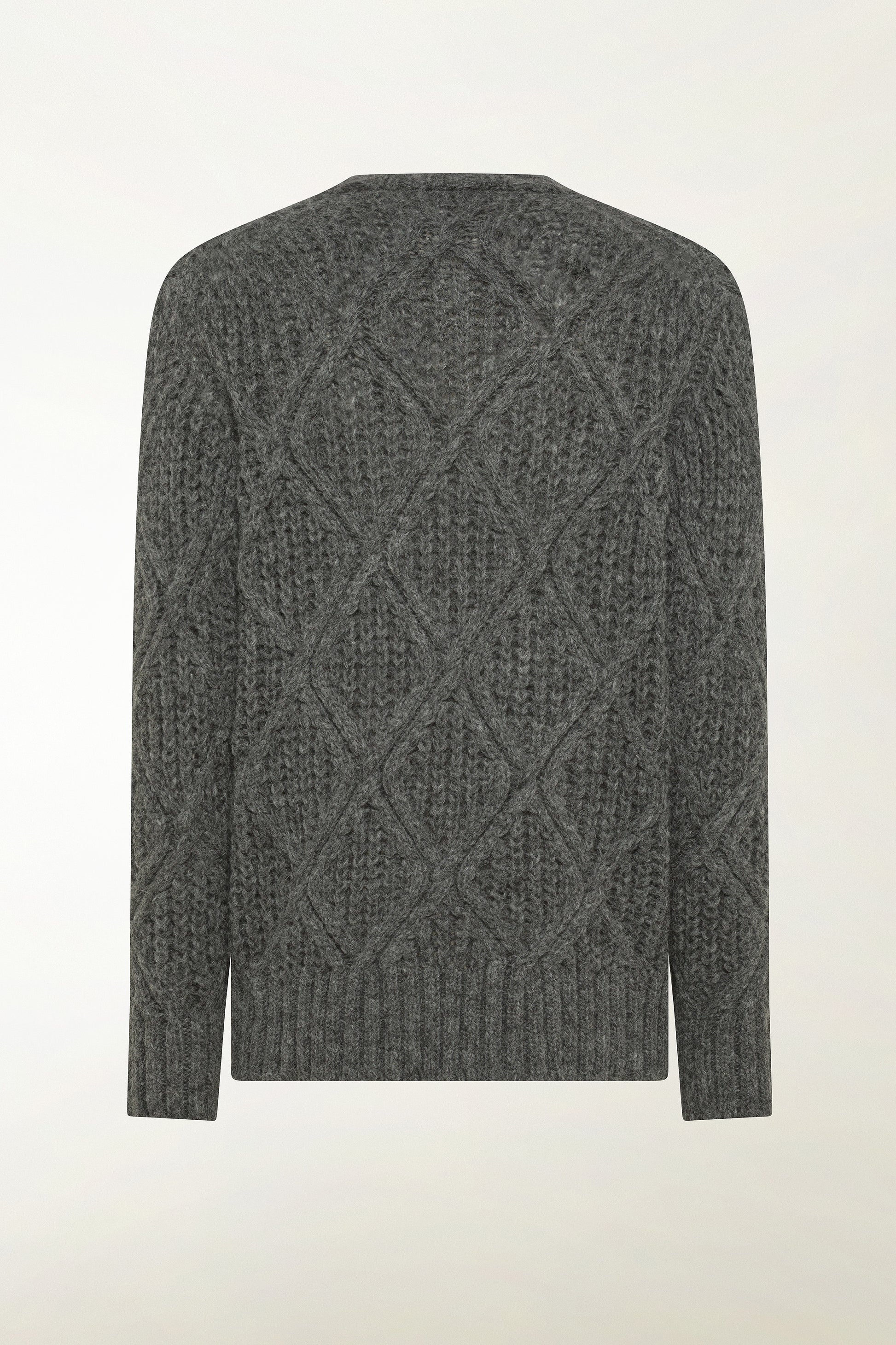 Crew neck, long-sleeved sweater, made from a yarn composed of 70% baby alpaca, 23% polyamide and 7% wool, worked in a 3 gauge Diamond Cob Stitch, a raised knit characterised by a diamond pattern that gives structure and depth to the garment.