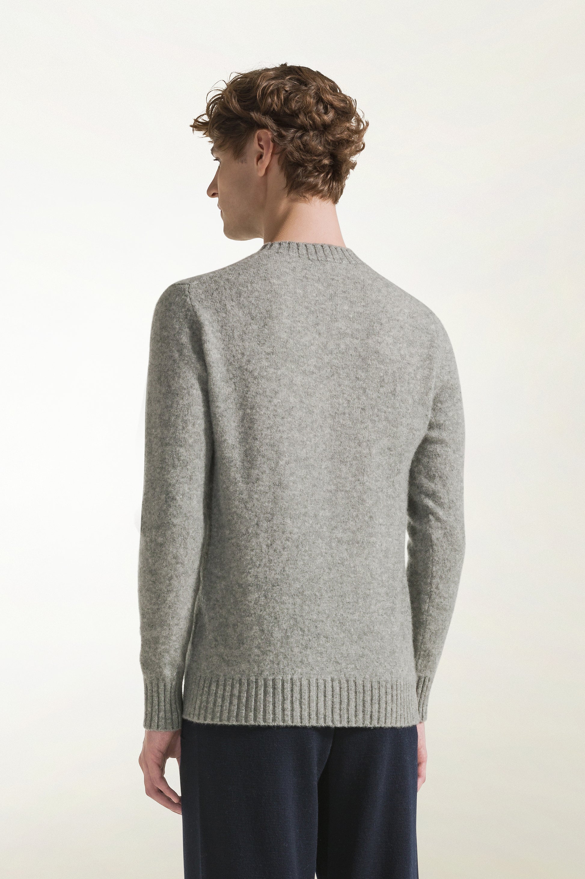 Long-sleeved sweater with round neck and ribbed trim on the collar, cuffs and hem in light grey. made from a yarn composed of 71% cashmere, 19% silk and 10% polyester, worked in gauge 7 with Plain Stitch, a regular stockinette stitch that enhances the simplicity of the design and the balance between softness and structure.