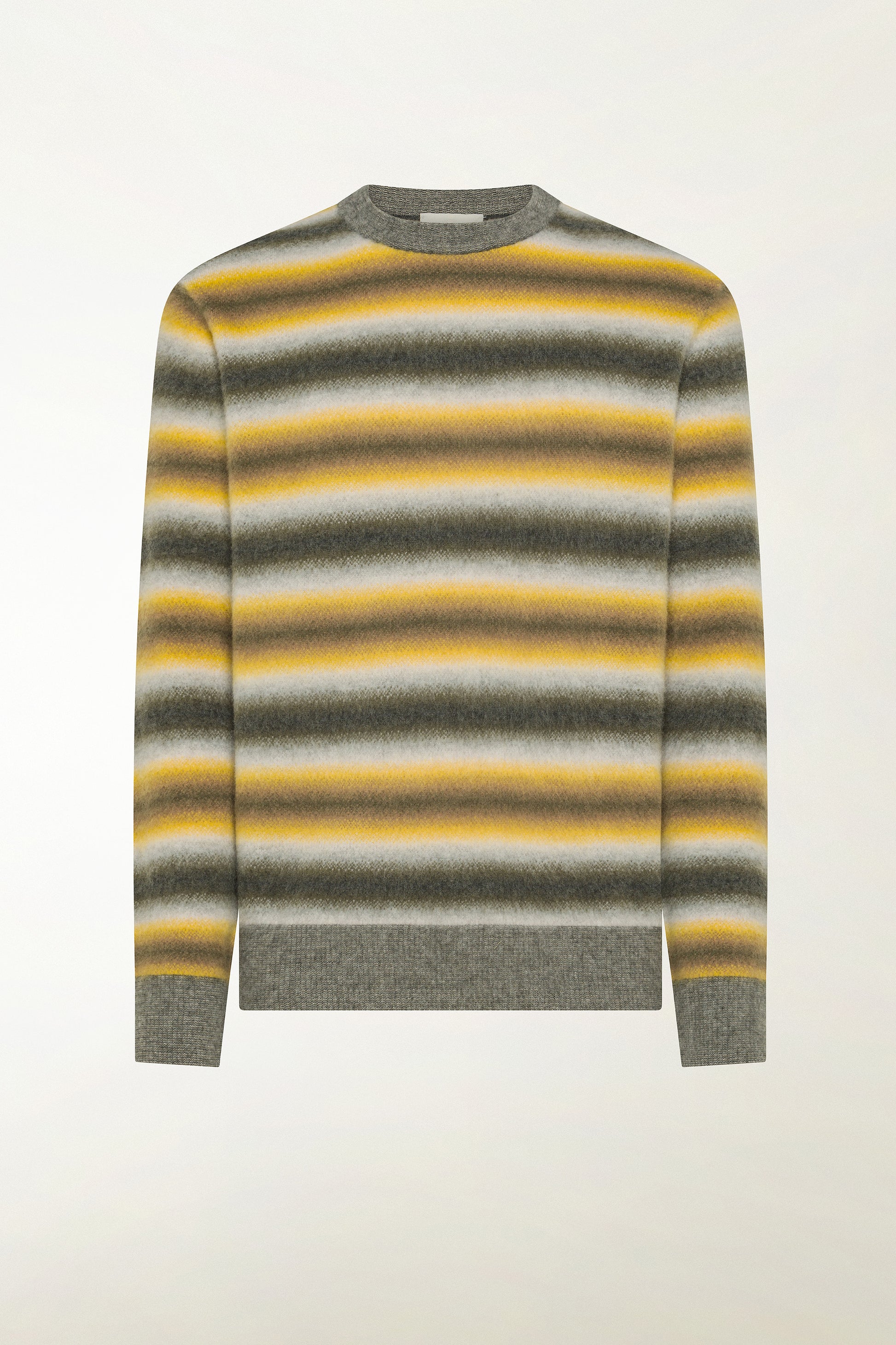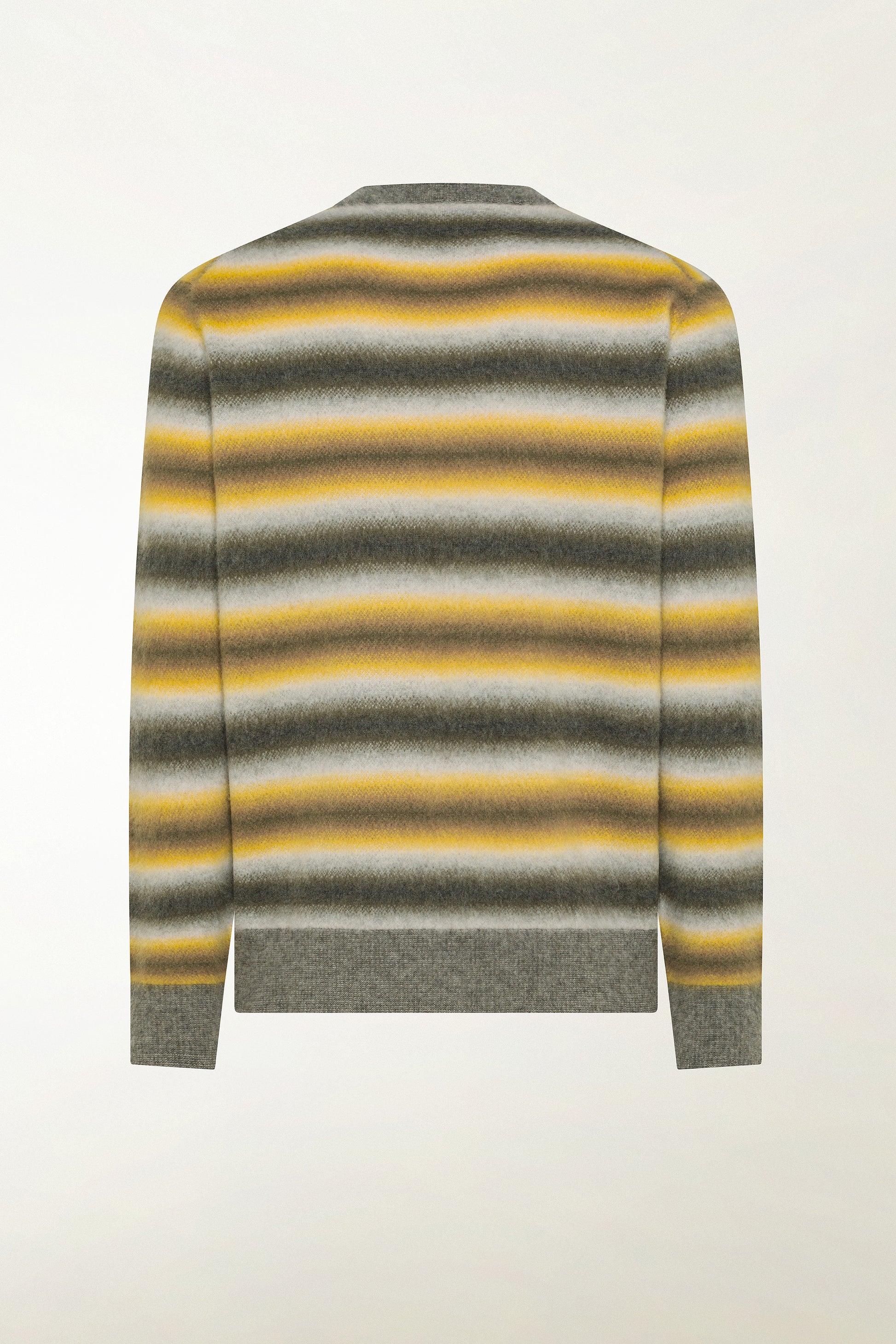 Worked in 12 gauge with Combed Degradé Fairisle stitch, a technique that combines the Fairisle design with a continuous, shaded effect between the different bands of color.