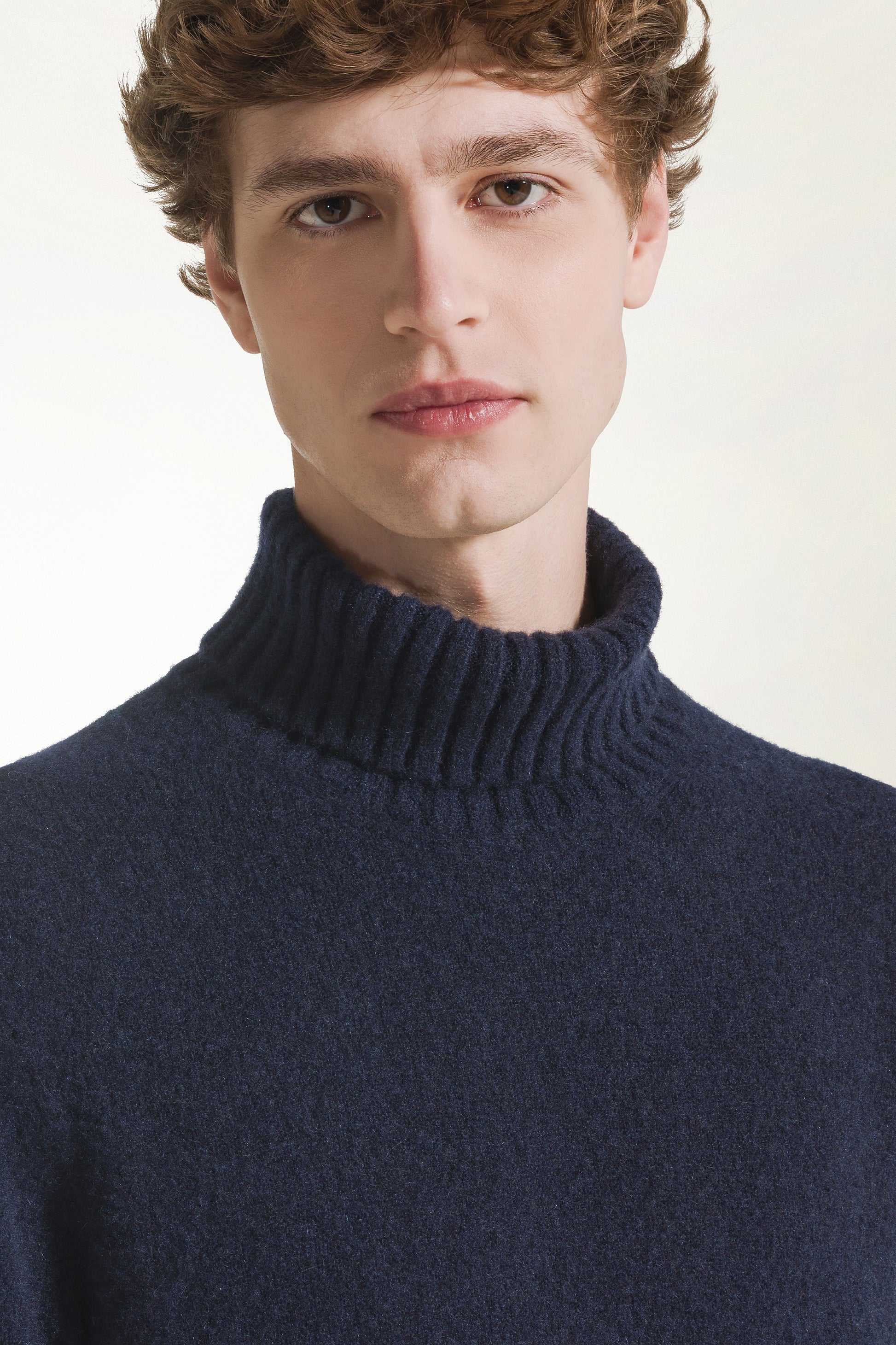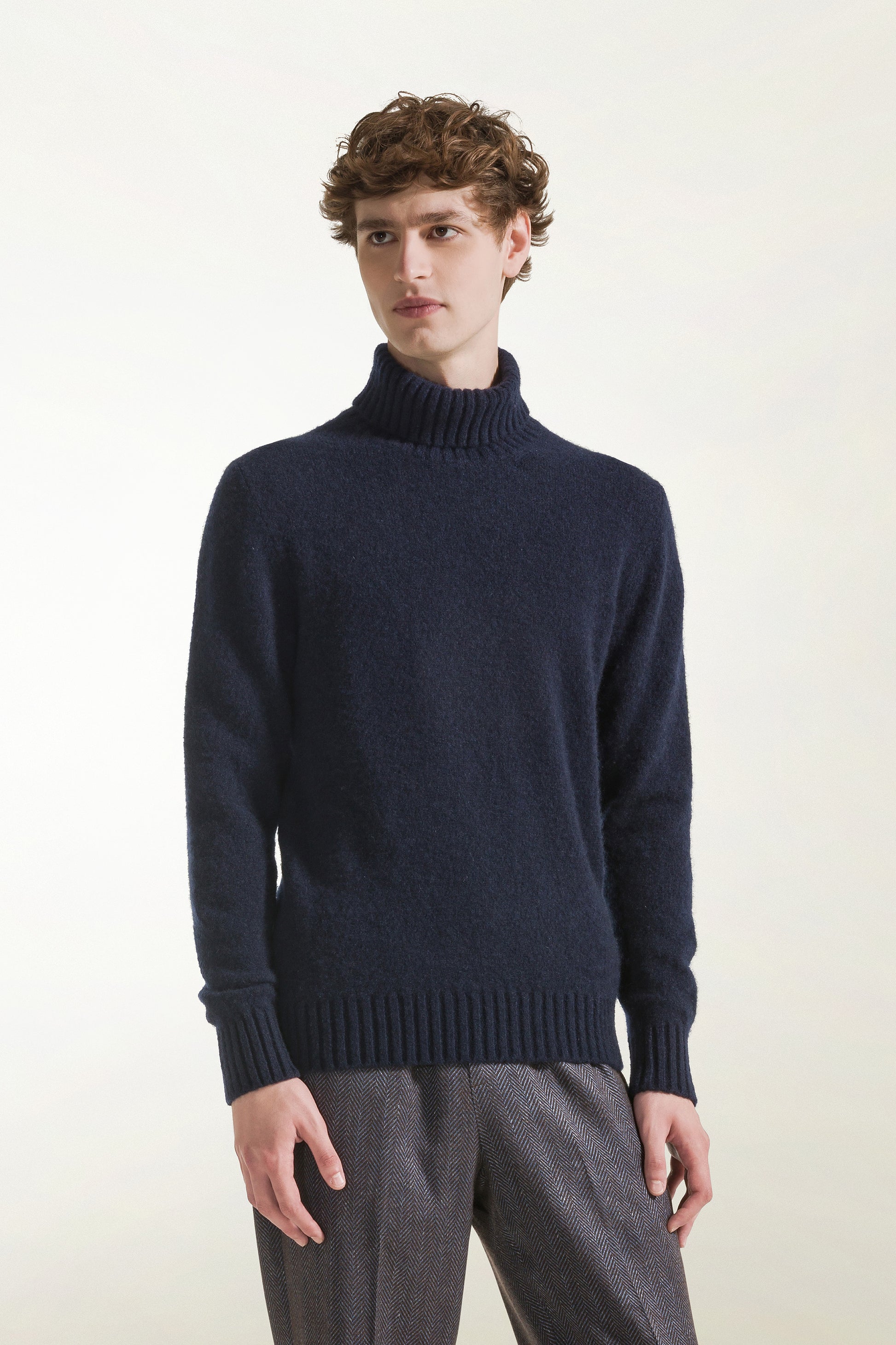 Il colore blu conferisce al capo eleganza, mentre la mano calda e morbida lo rende ideale per i climi più rigidi, coniugando comfort termico e raffinatezza essenziale.