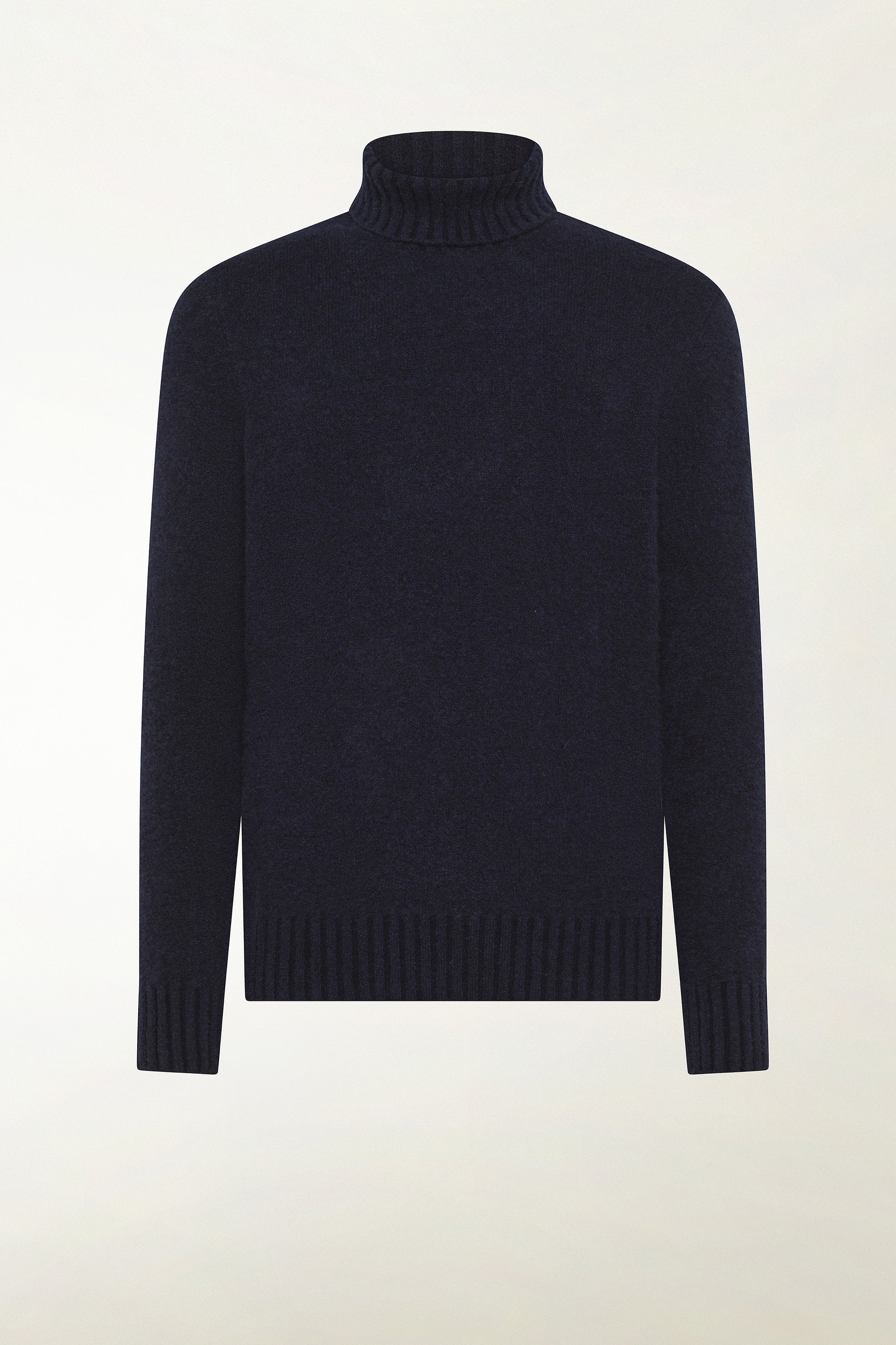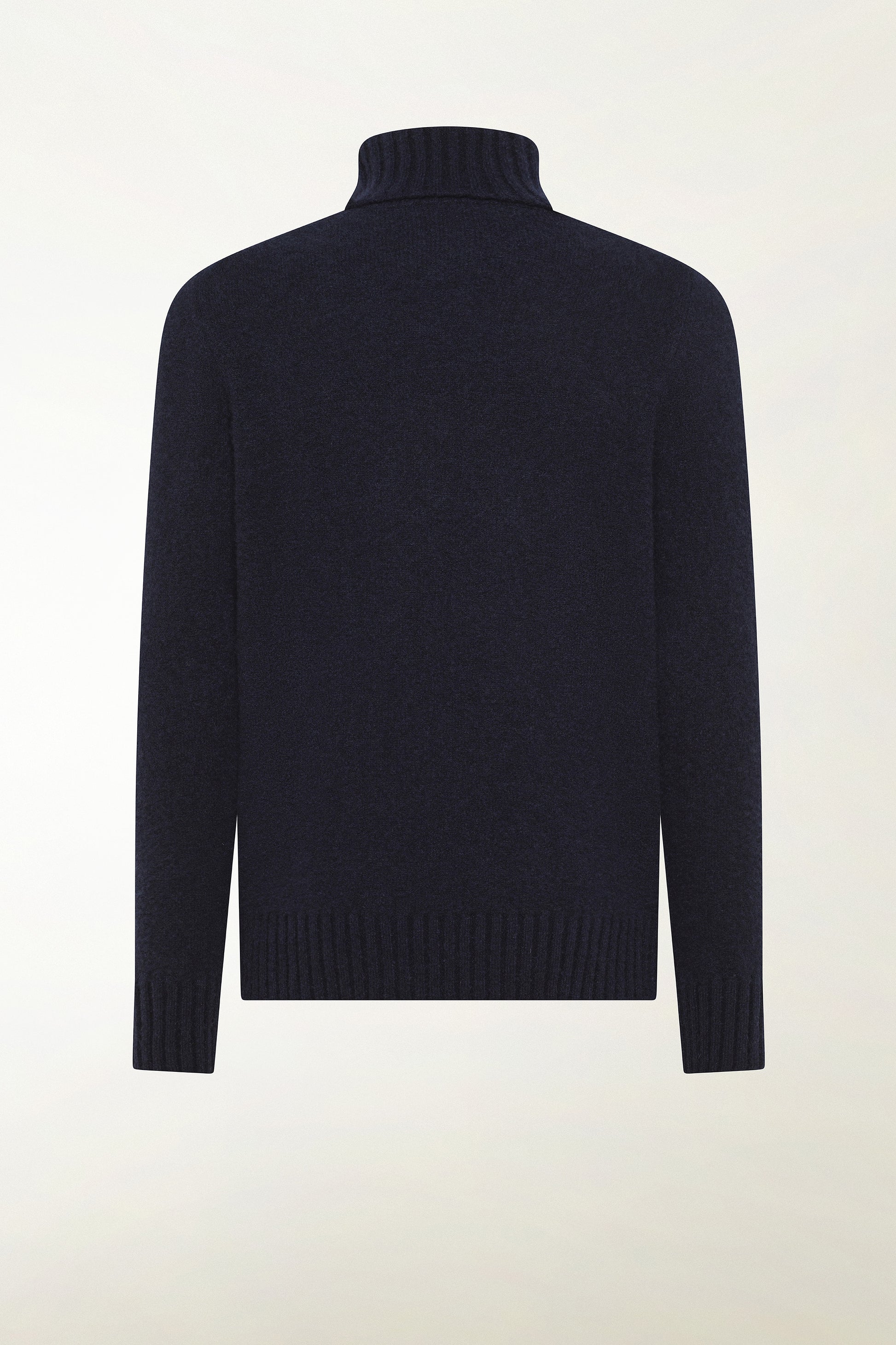 Dolcevita a maniche lunghe con finiture a coste su collo alto, polsini e fondo, realizzato in filato composto da 71% cashmere, 19% seta e 10% poliestere, lavorato in finezza 7 con punto Plain Stitch, una maglia rasata regolare che valorizza la linearità del modello e la qualità del filato.