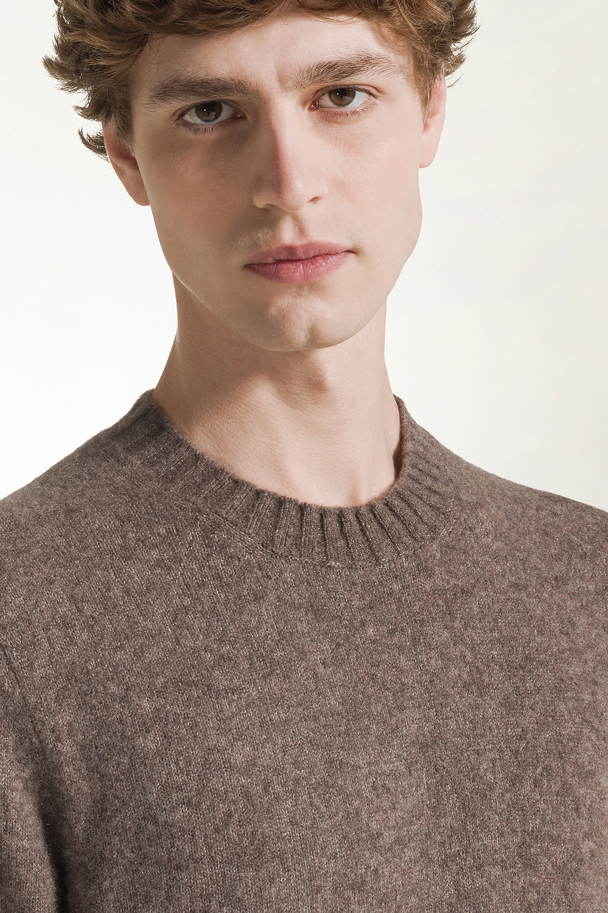 Maglione a maniche lunghe con collo rotondo e finiture a coste su colletto, polsini e fondo colore nocciola, realizzato in filato composto da 71% cashmere, 19% seta e 10% poliestere, lavorato in finezza 7 con punto Plain Stitch, una maglia rasata regolare che valorizza la semplicità del design e l’equilibrio tra morbidezza e struttura.