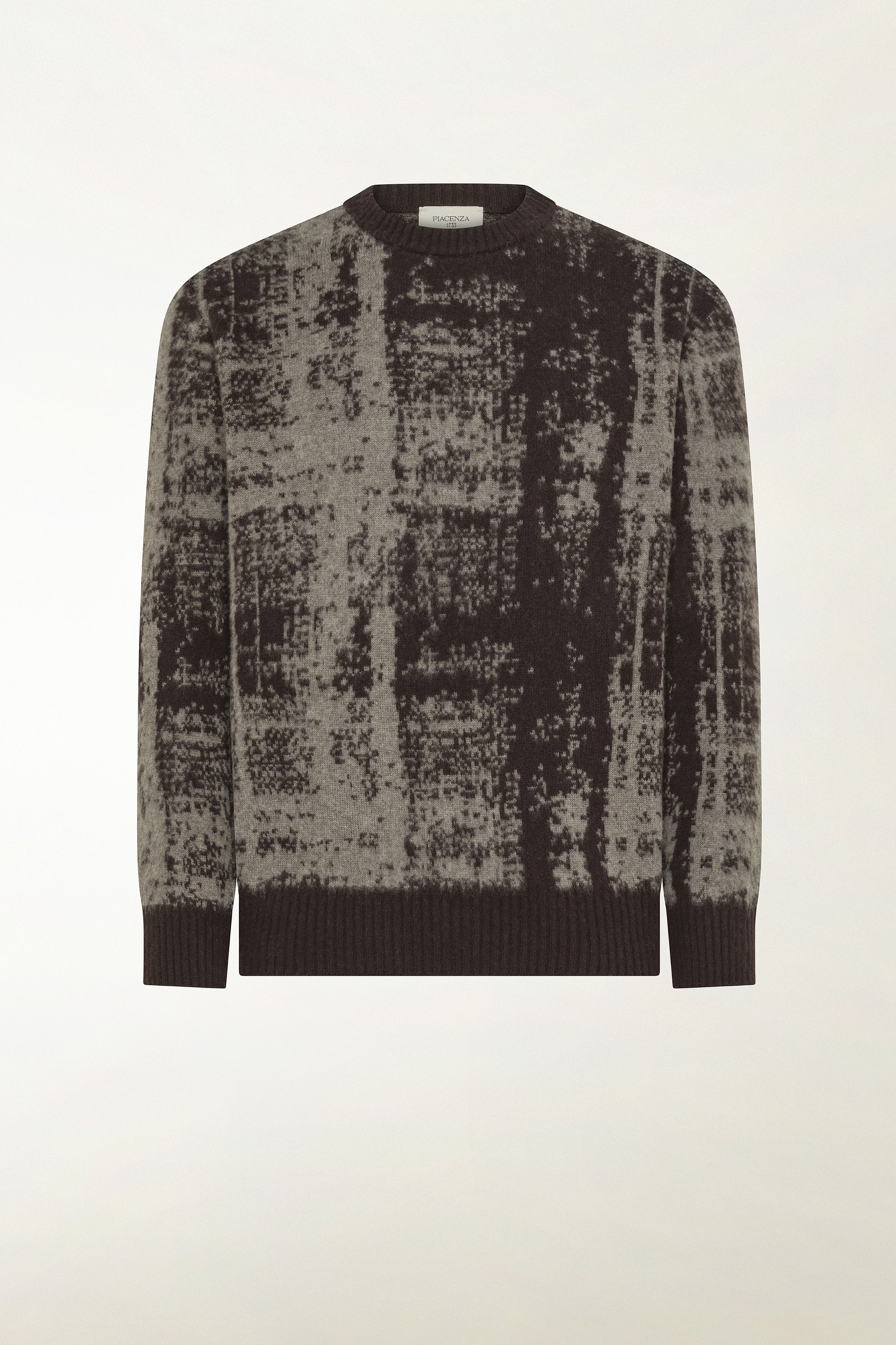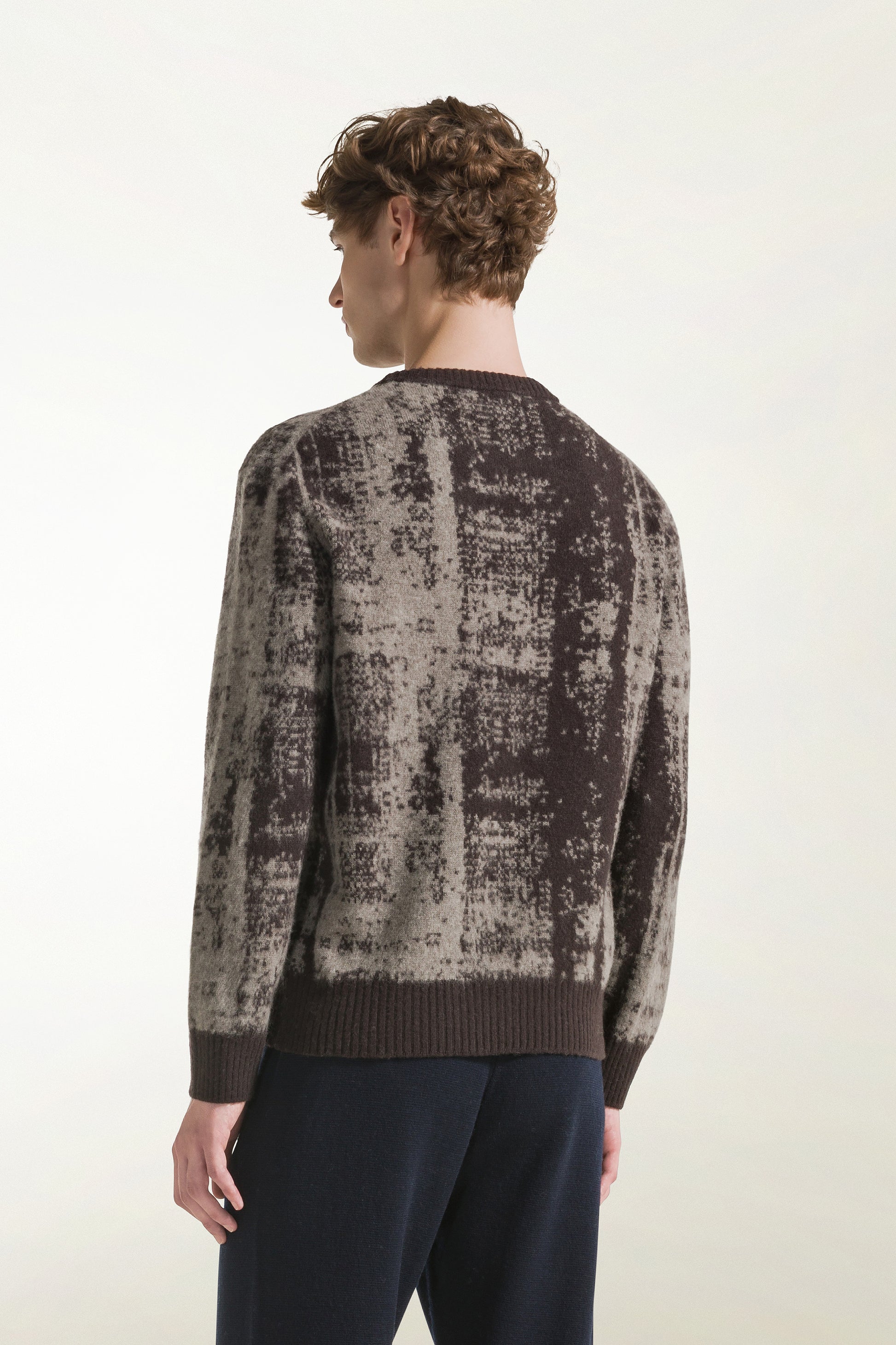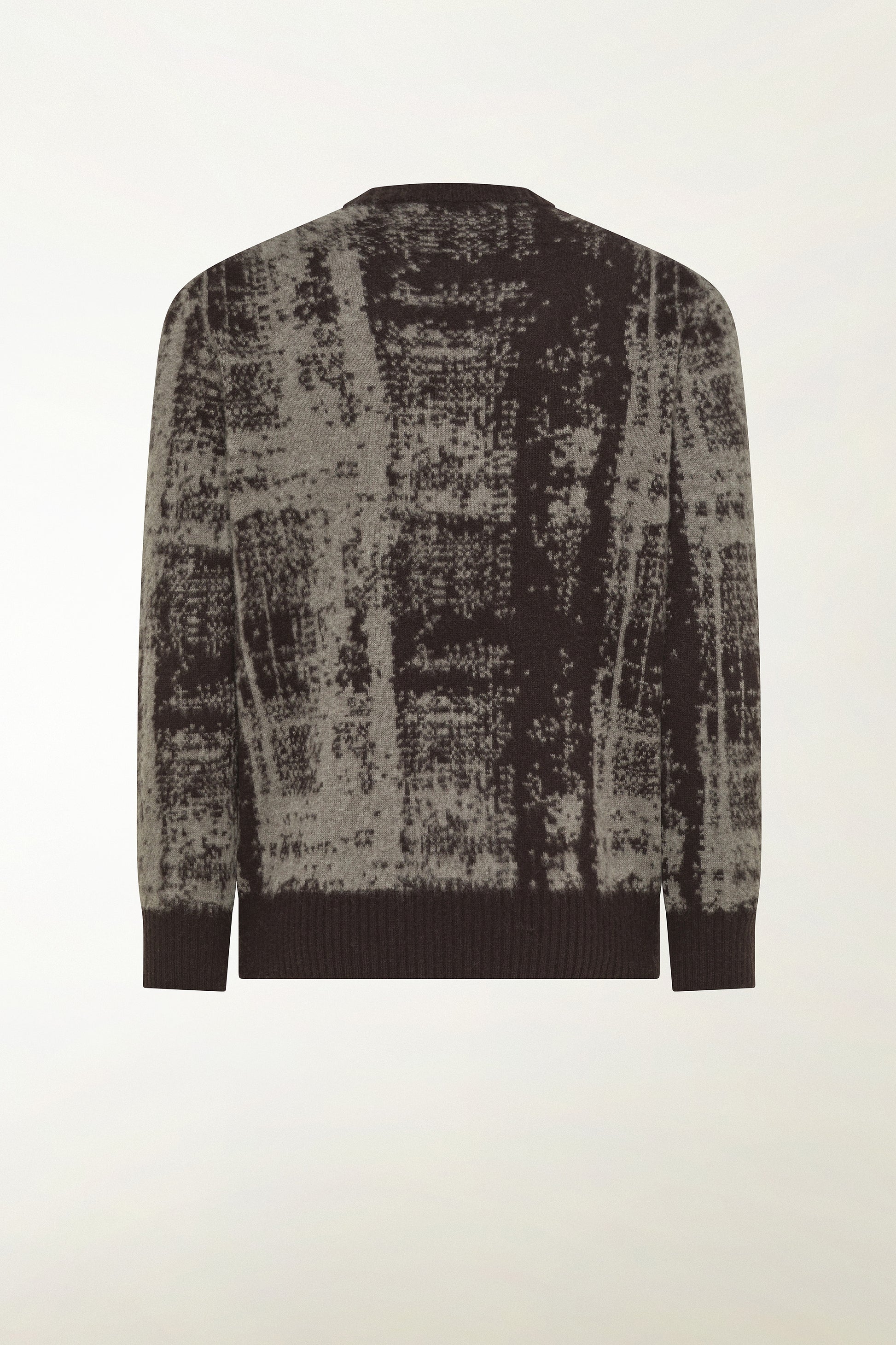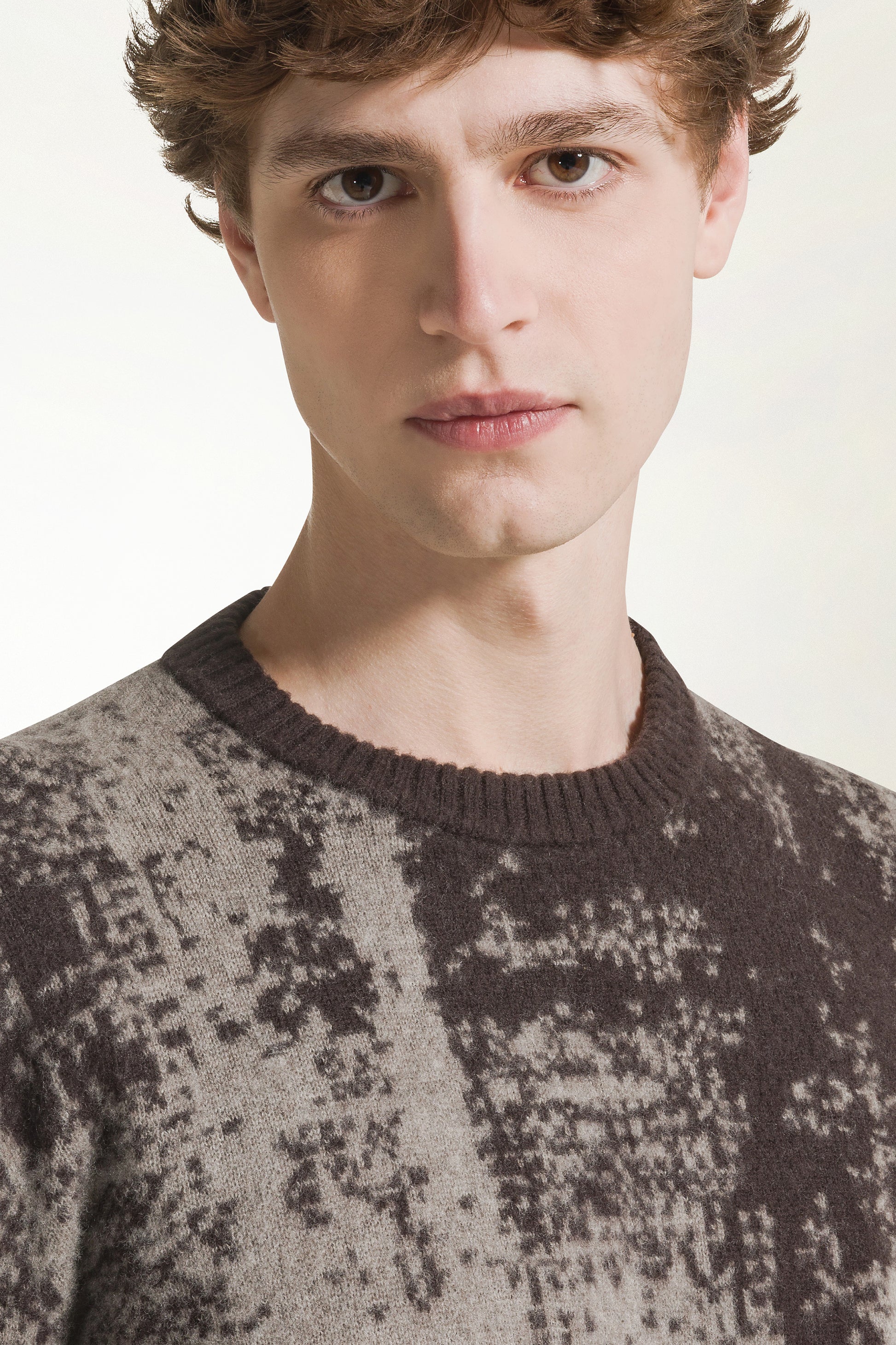 Maglione girocollo a maniche lunghe, realizzato in 100% lana vergine e lavorato in finezza 12 con punto Combed Pixel Plaid, una lavorazione che restituisce un disegno astratto a effetto sfumato, esaltando la precisione del dettaglio grafico e la qualità del filato.